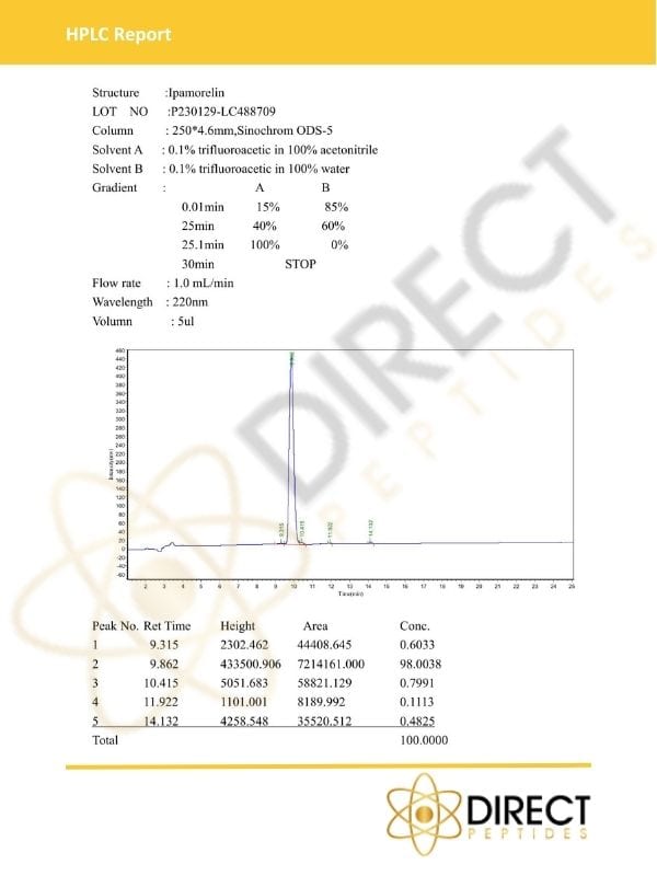 Direct Peptides offers the opportunity to buy Ipamorelin peptides of the highest purity (99%+), which are rigorously tested using mass spectrometry and HPLC to ensure consistency and quality.