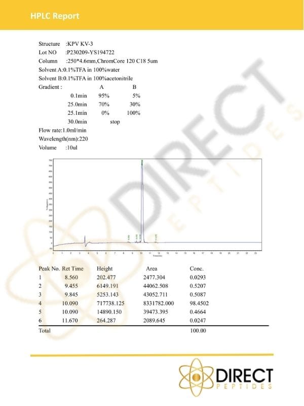 Direct Peptides ensures that all KPV peptides are of 99% purity and are manufactured to the highest quality standards. This makes them safe, reliable, and precise for research applications. However, it is intended strictly for research use and not for human consumption.