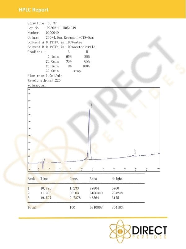 Buy LL-37 CAP-18 peptides with 99% purity from Direct Peptides, designed to meet strict research standards. Trusted for safety and reliability, our products help researchers achieve accurate results with confidence.