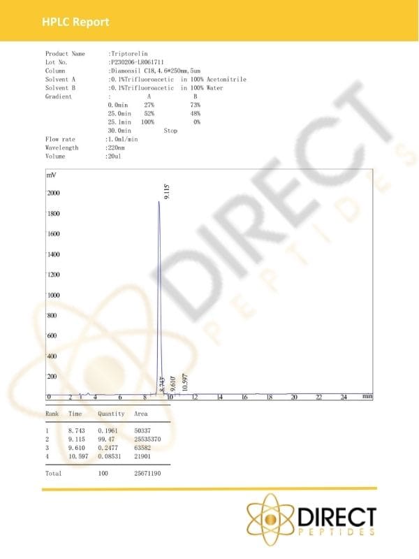 However, if you are looking to buy Triptorelin for research purposes, it is important to note that the peptide provided by Direct Peptides is not intended for human use. It should only be handled by qualified professionals in controlled laboratory settings.